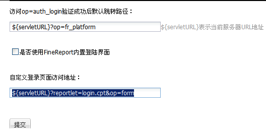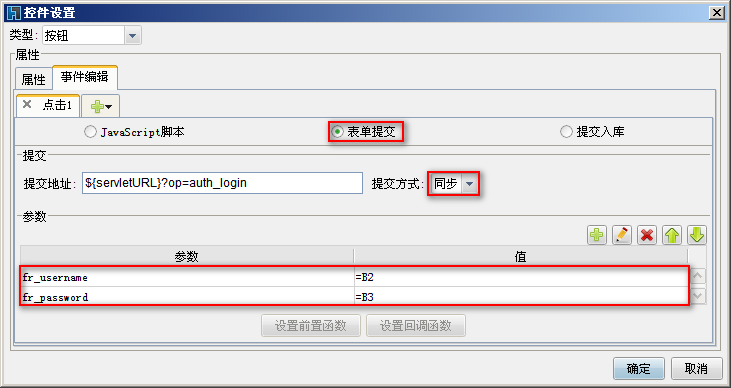注:提交地址必须为${servletURL}?op=auth_login,用来提交输入的用户名和密码,提交方式:同步。而且:fr_username、fr_password是我们报表默认的参数,所以调用时大小写必须保持一致。