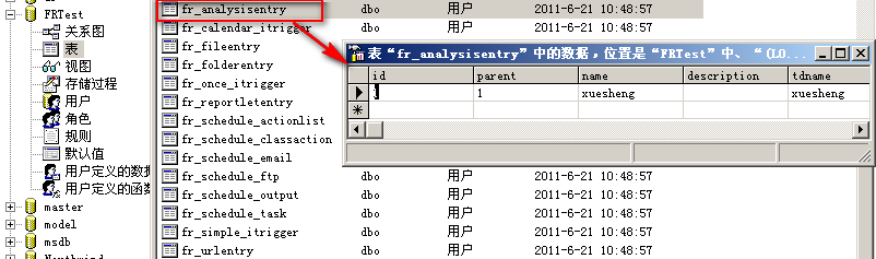 运行管理平台,配置信息,就会在SQL Server2000数据库中自动创建fr表保存相应的设置了,如下图: